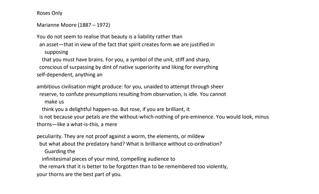 “Roses Only” is an open critique admonishing poets and readers alike that beauty is not the “without-which-nothing of preminence” of poetry. A seductive verse is expected to have point, or thorn as the case may be, and that point is of more consequence than the structure. She tells us that though we may admire the petals, it’s the thorns that impact us.